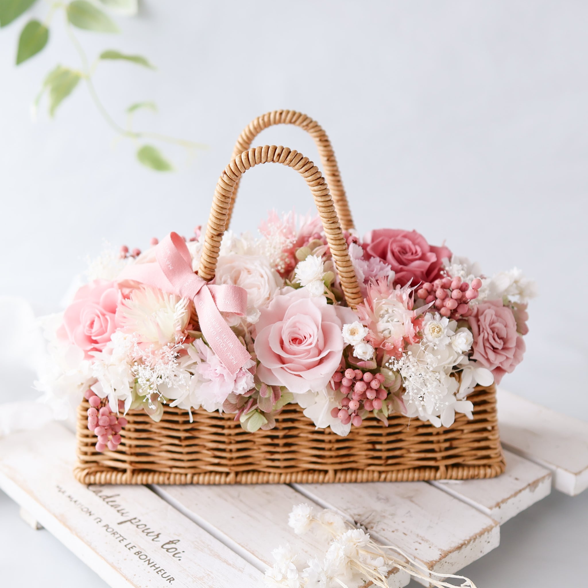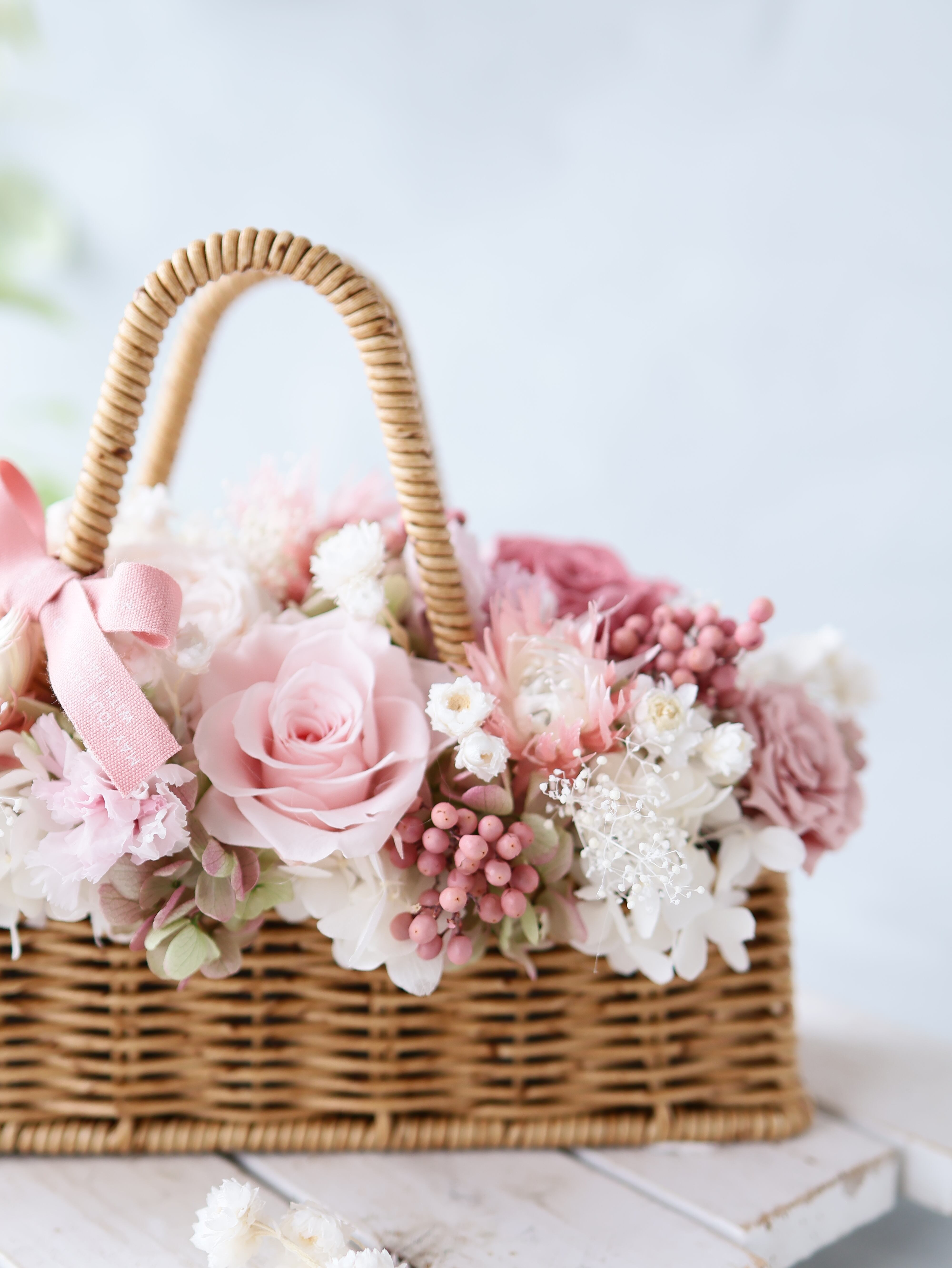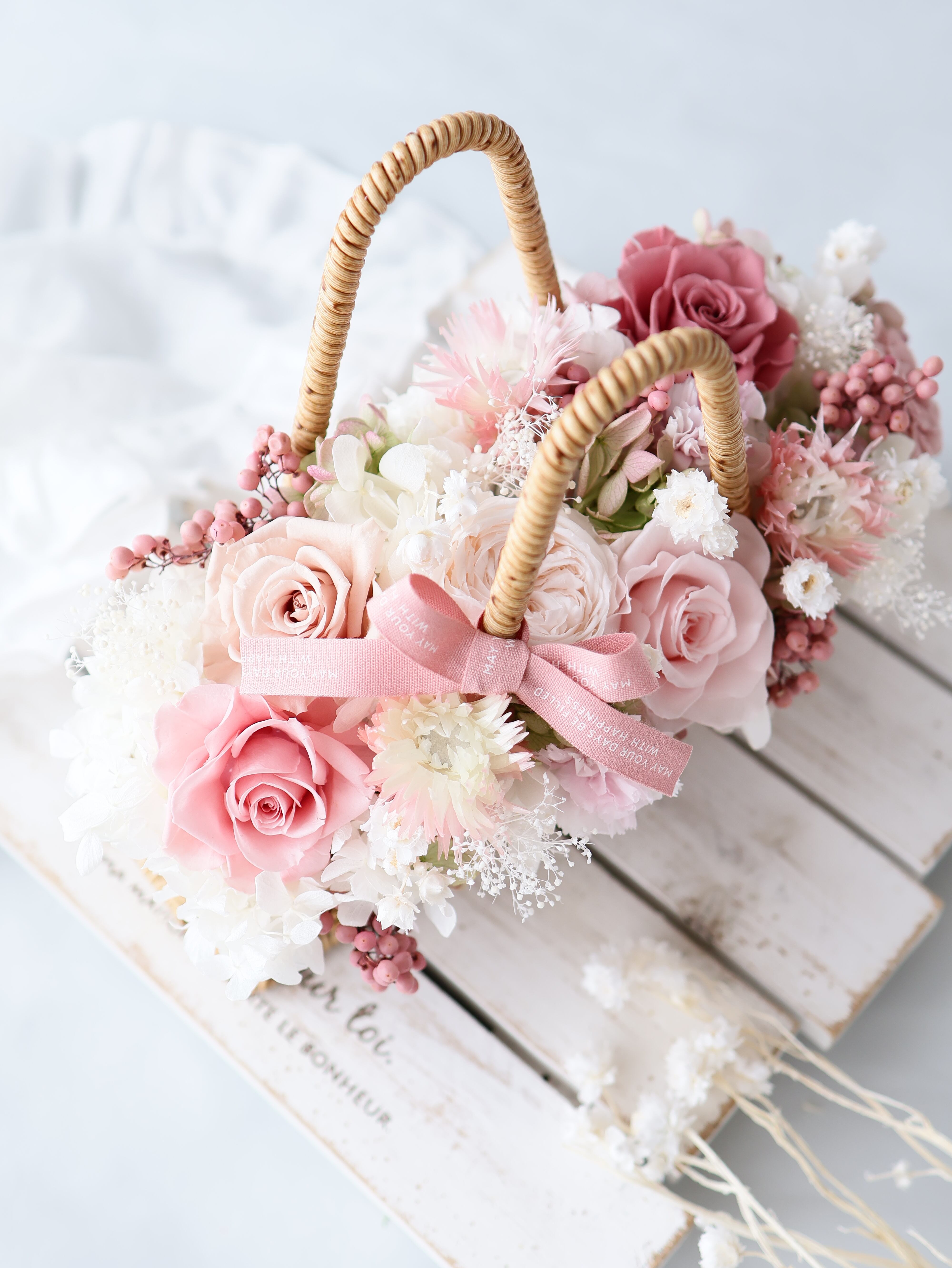 母の日ギフトにぴったりな優しい雰囲気のバスケットアレンジをつくりました。