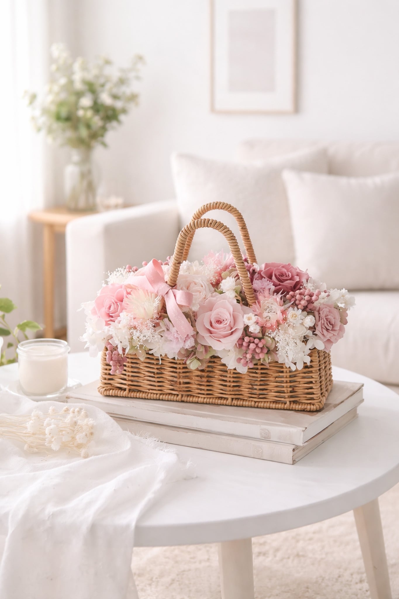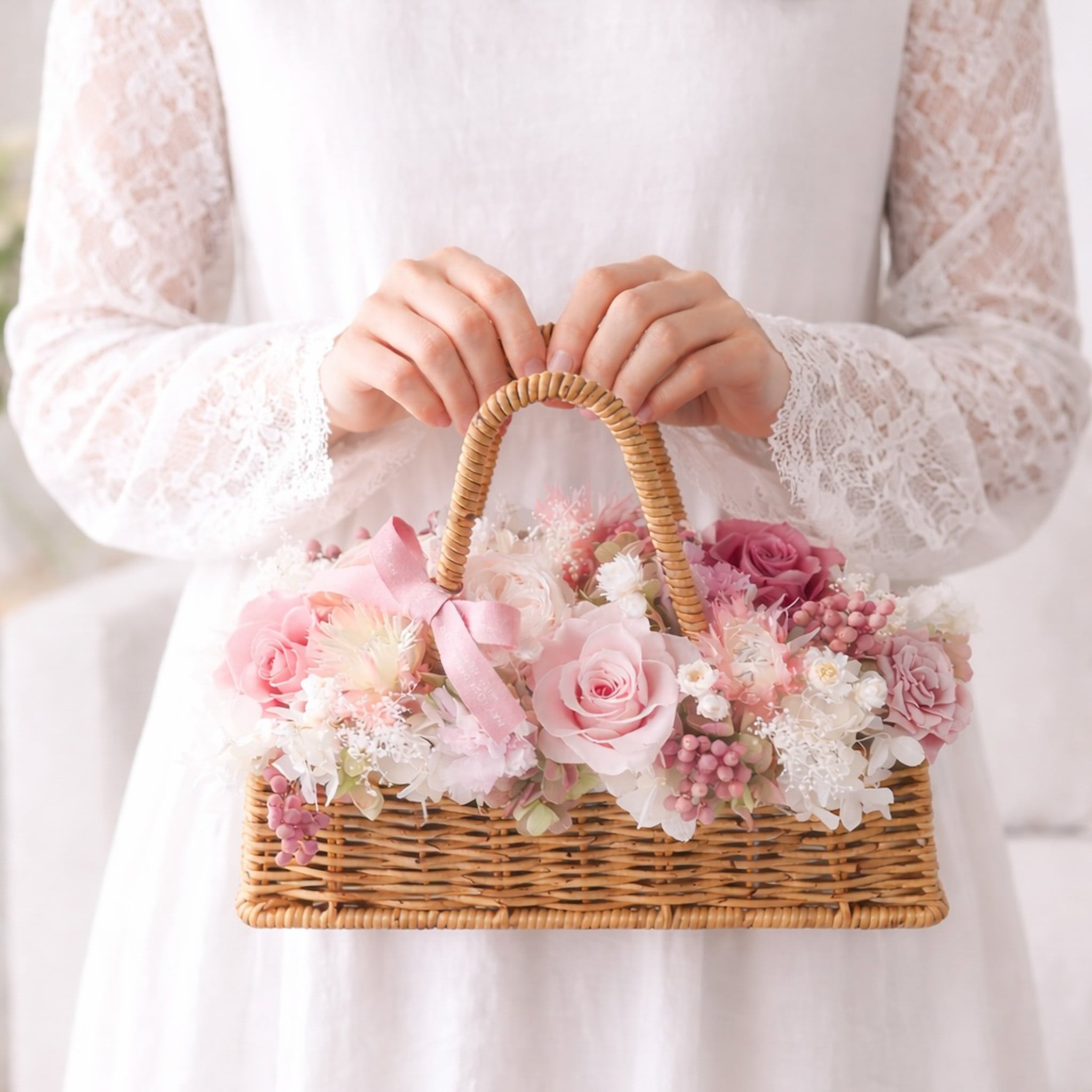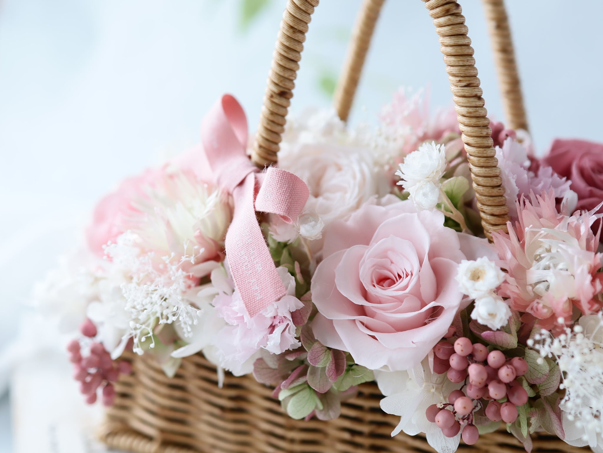 母の日ギフトにぴったりな優しい雰囲気のバスケットアレンジをつくりました。