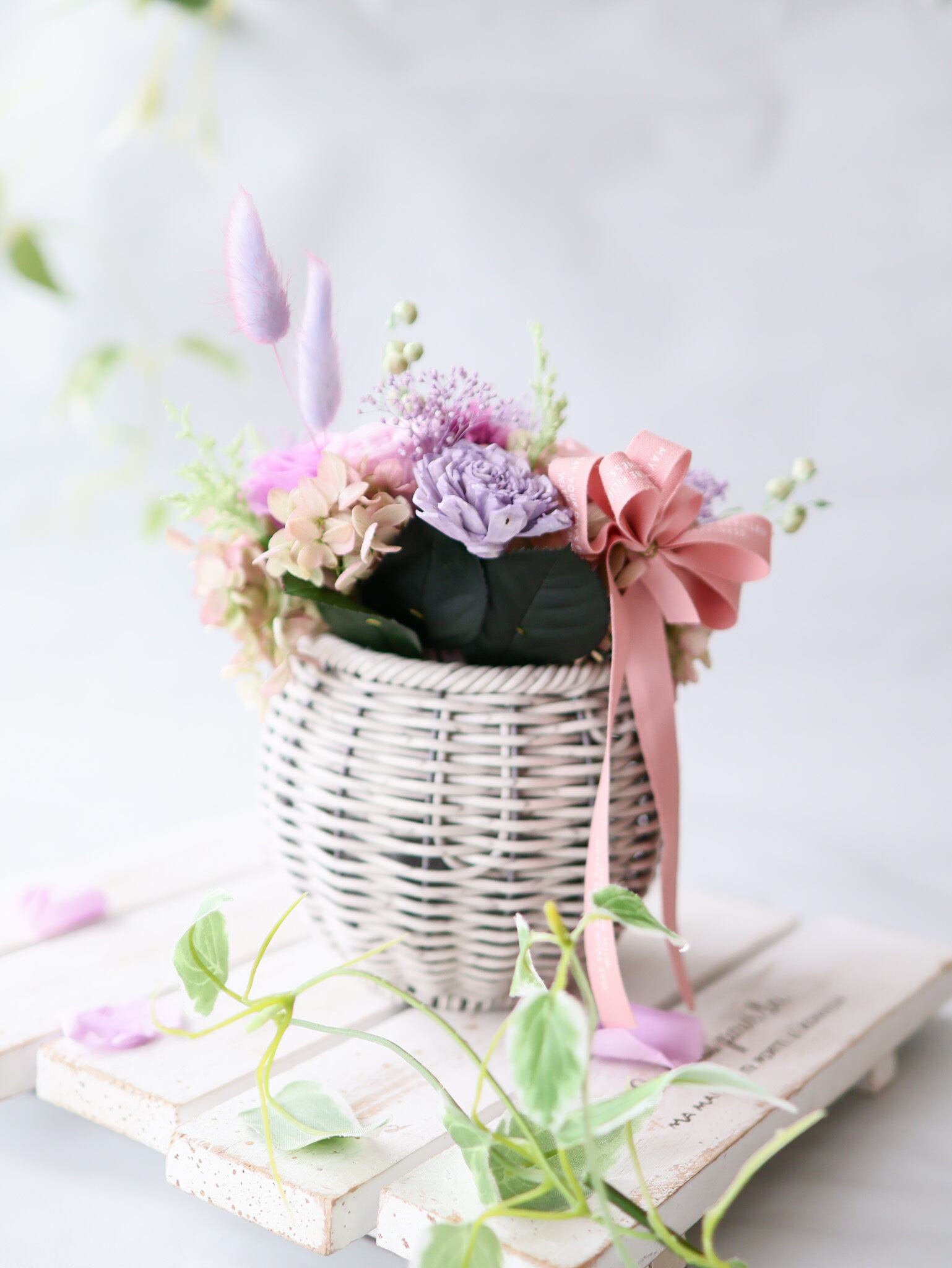 母の日ギフトにぴったりなバスケットアレンジをつくりました。