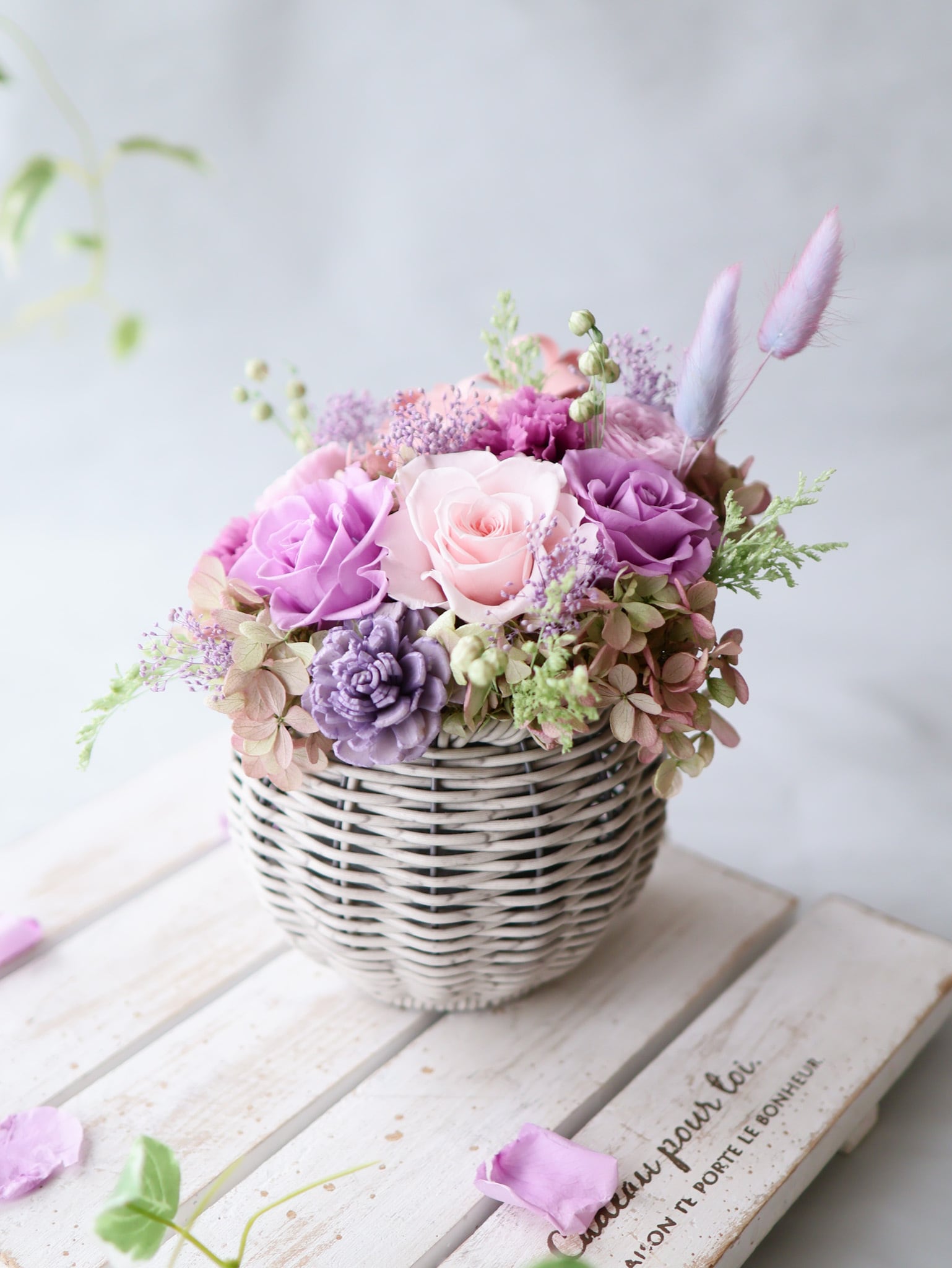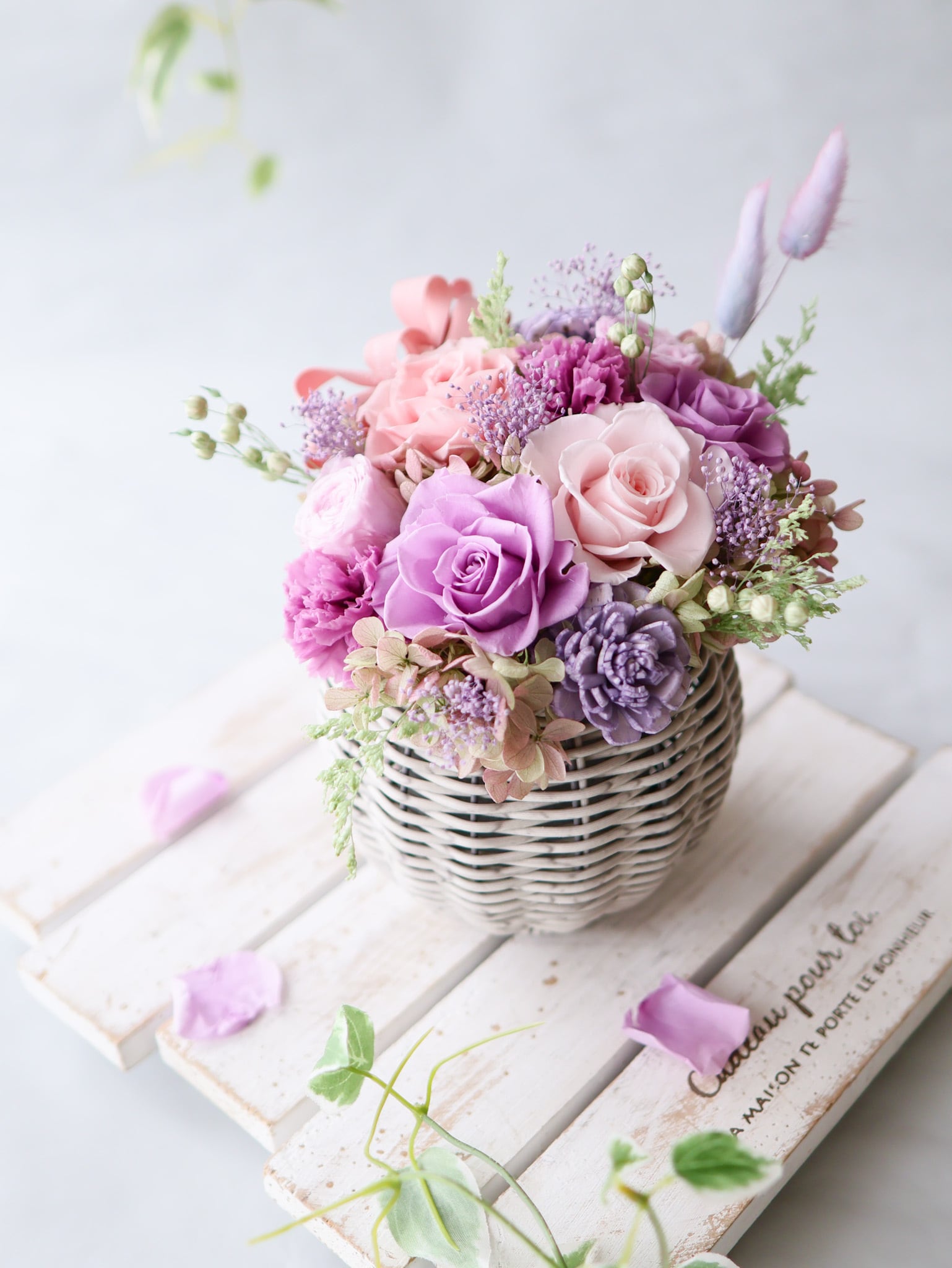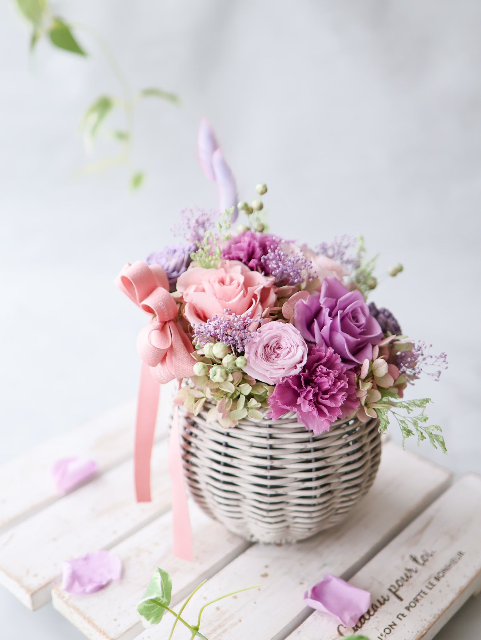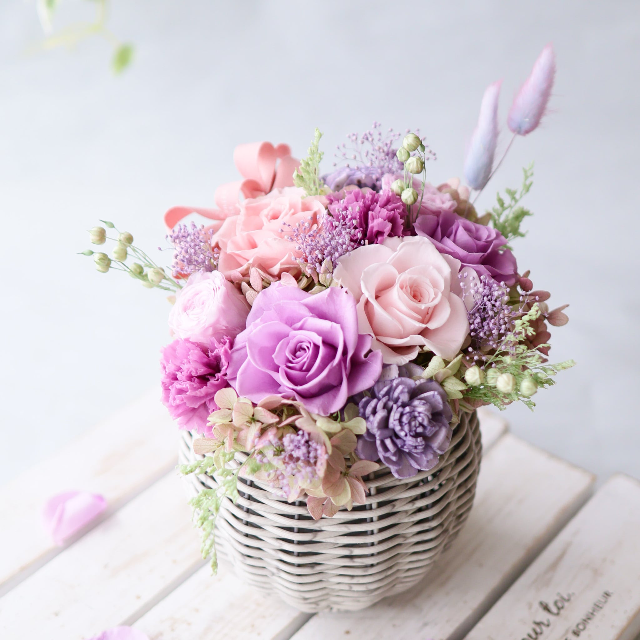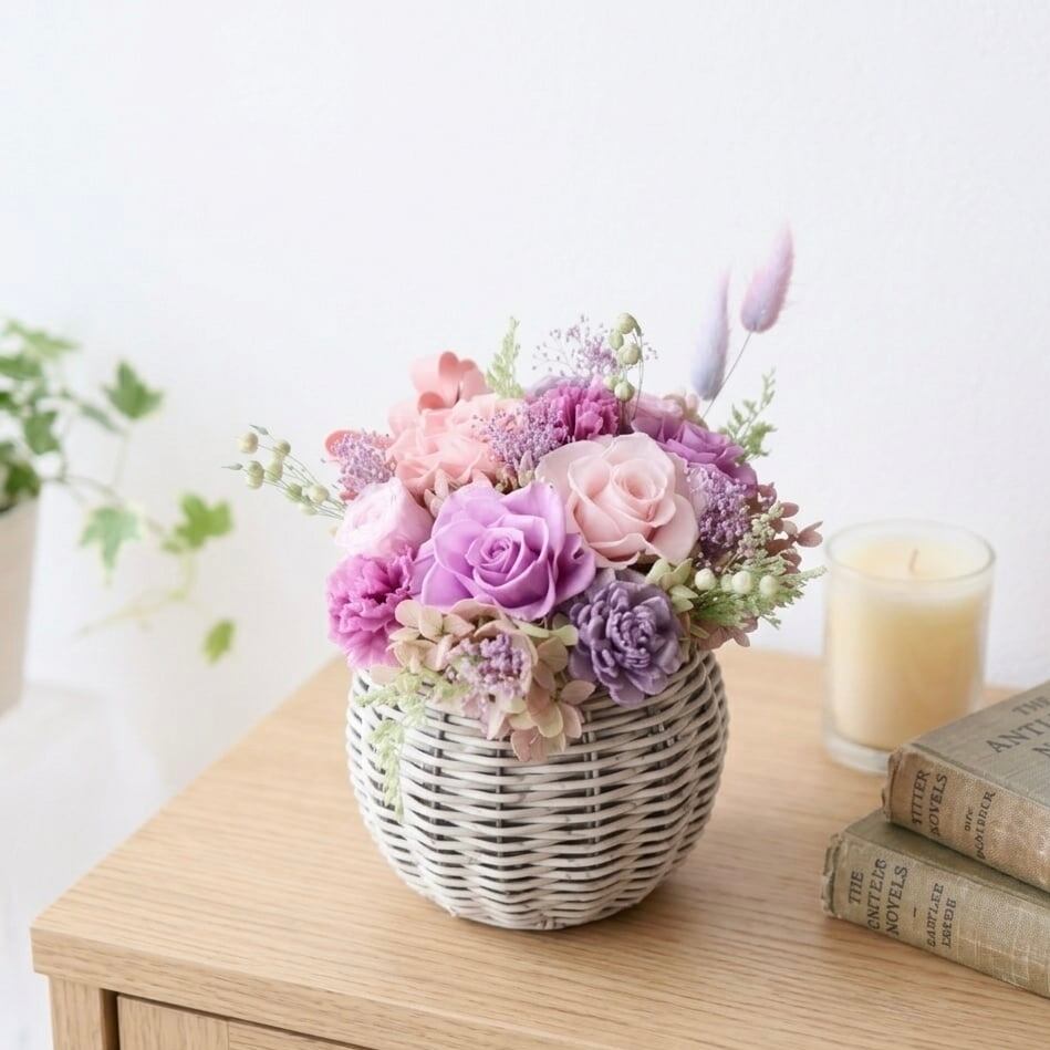 毎年人気のパープル×ピンクのグラデーションカラーでまとめたバスケットアレンジ。