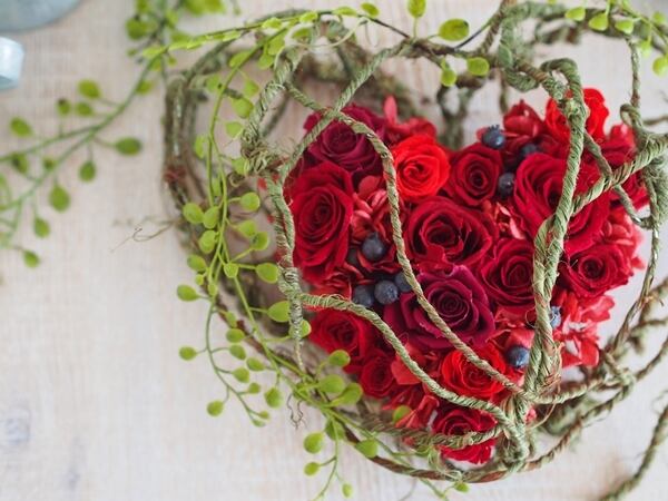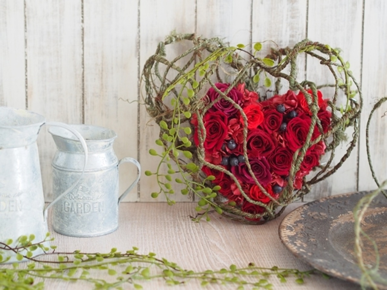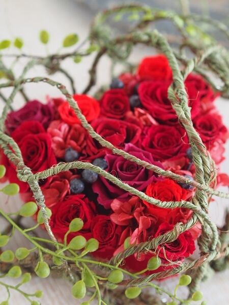深紅のローズをたっぷり敷き詰めたおしゃれなハート型のバスケットアレンジ。
